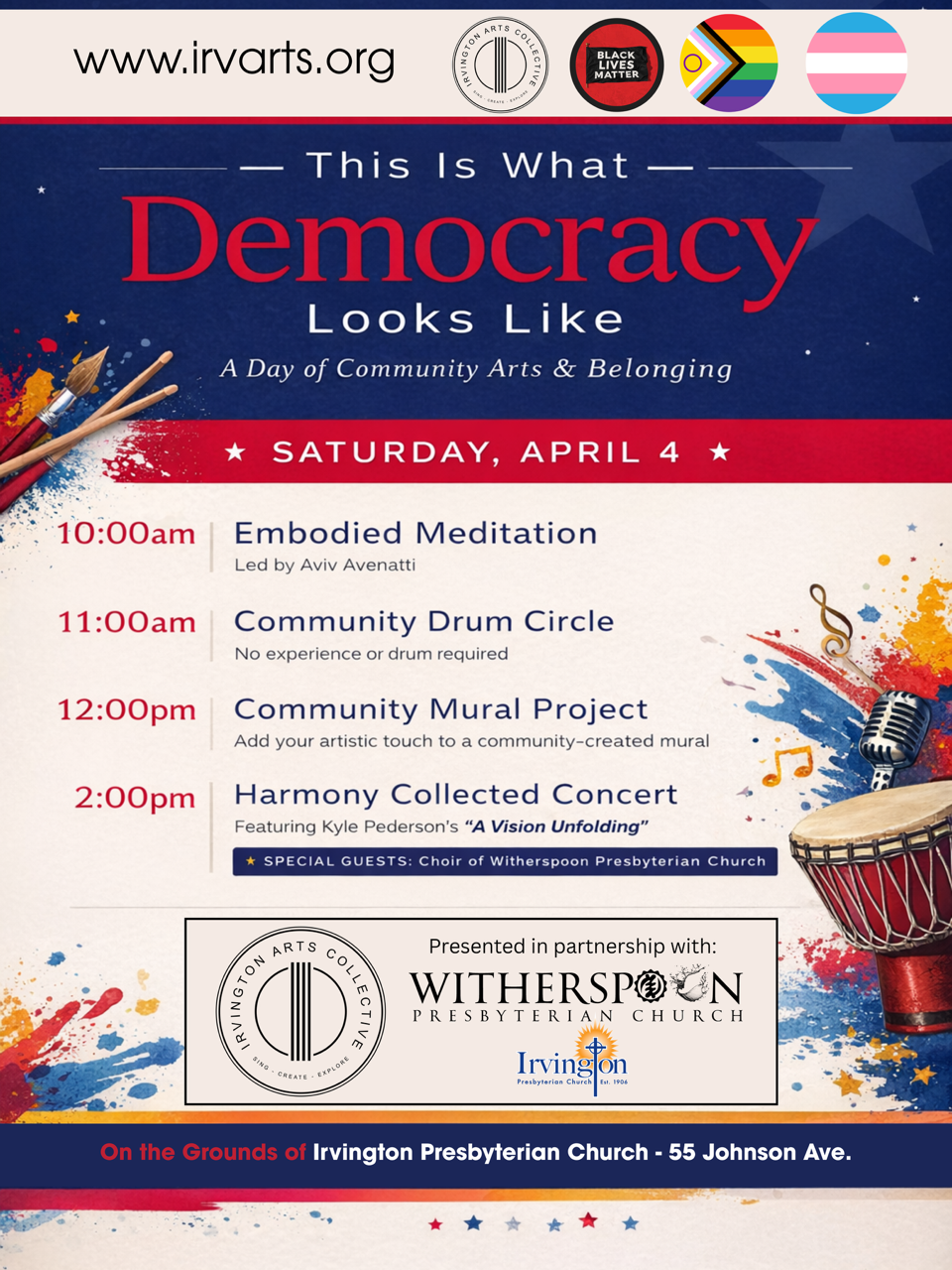 We are deeply grateful to Irvington Presbyterian Church for its unwavering support and partnership in making the Irvington Arts Collective a reality. Founded in 1906, IPC has been a cornerstone of the Irvington community for over a century. The church's dedication to fostering spiritual growth, community connection, and outreach aligns perfectly with IAC's mission to create a space for creativity, justice, and personal growth. Through their generous support, IPC has provided us with the physical space to bring our arts programs to life and engage the community.